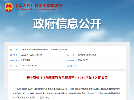 2026年1月9日,生态环境部在其官网正式发布《危险废物排除管理清单(2026年版)》。公告指出,为贯彻落实《中华人民共和国固体废物污染环境防治法》,按照《强化危险废物监管和利用处置能力改革实施方案》(国办函〔2021〕47号)有关要求,完善危险废物鉴别制度,推进分级分类管理,生态环境部修订了《危险废物排除管理清单(2026年版)》(见附件),现予公布。